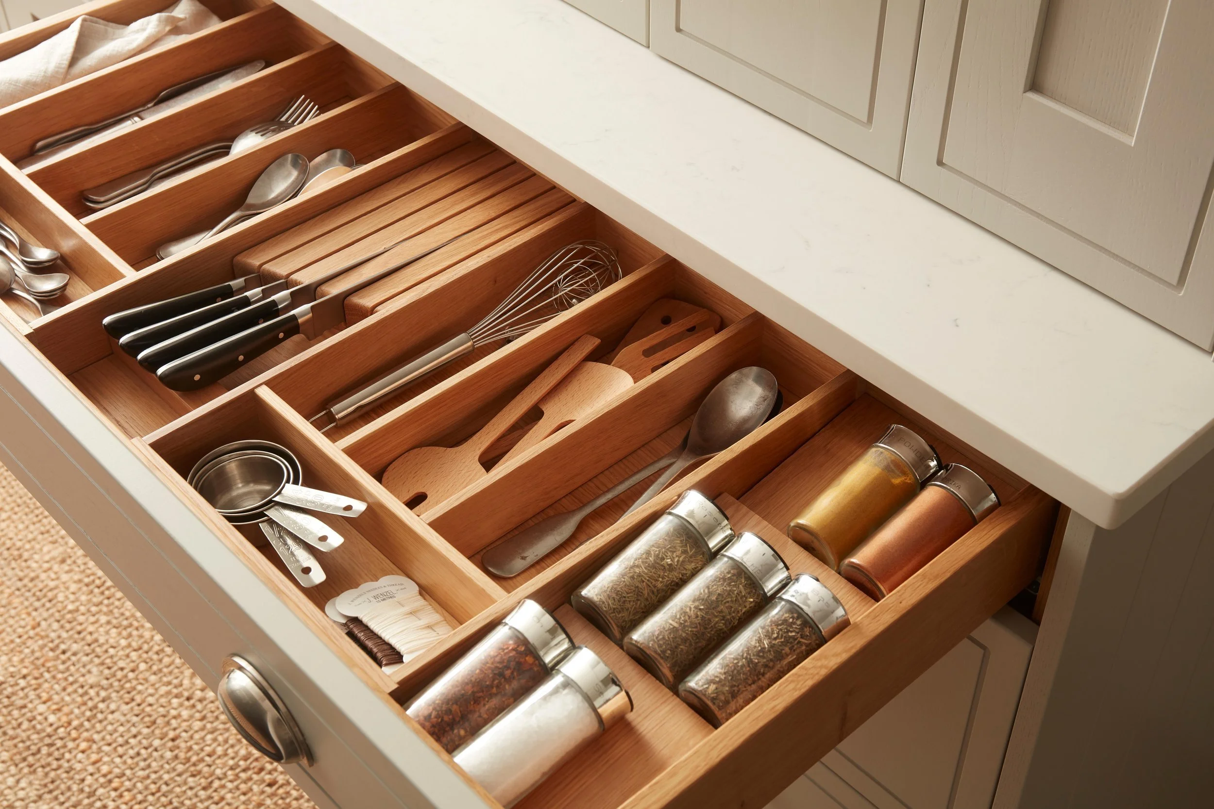 We work with selected British and European partners across cabinet systems, appliances, sinks, taps, and surfaces so that design and manufacture remain aligned with quality, durability, and fit. That matters because a quality kitchen is never the result of fronts alone. Thickness, joinery, internals, finish consistency, and how each unit is specified all matter. Those details bespeak care, and they are often what separate a bespoke kitchen from something that only looks bespoke at first glance.